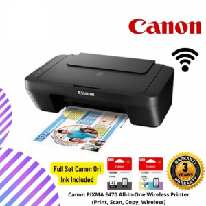 Canon PIXMA E470 All-In-One Wireless Printer (Print, Scan, Copy, Wireless) Ink Black & Color Included