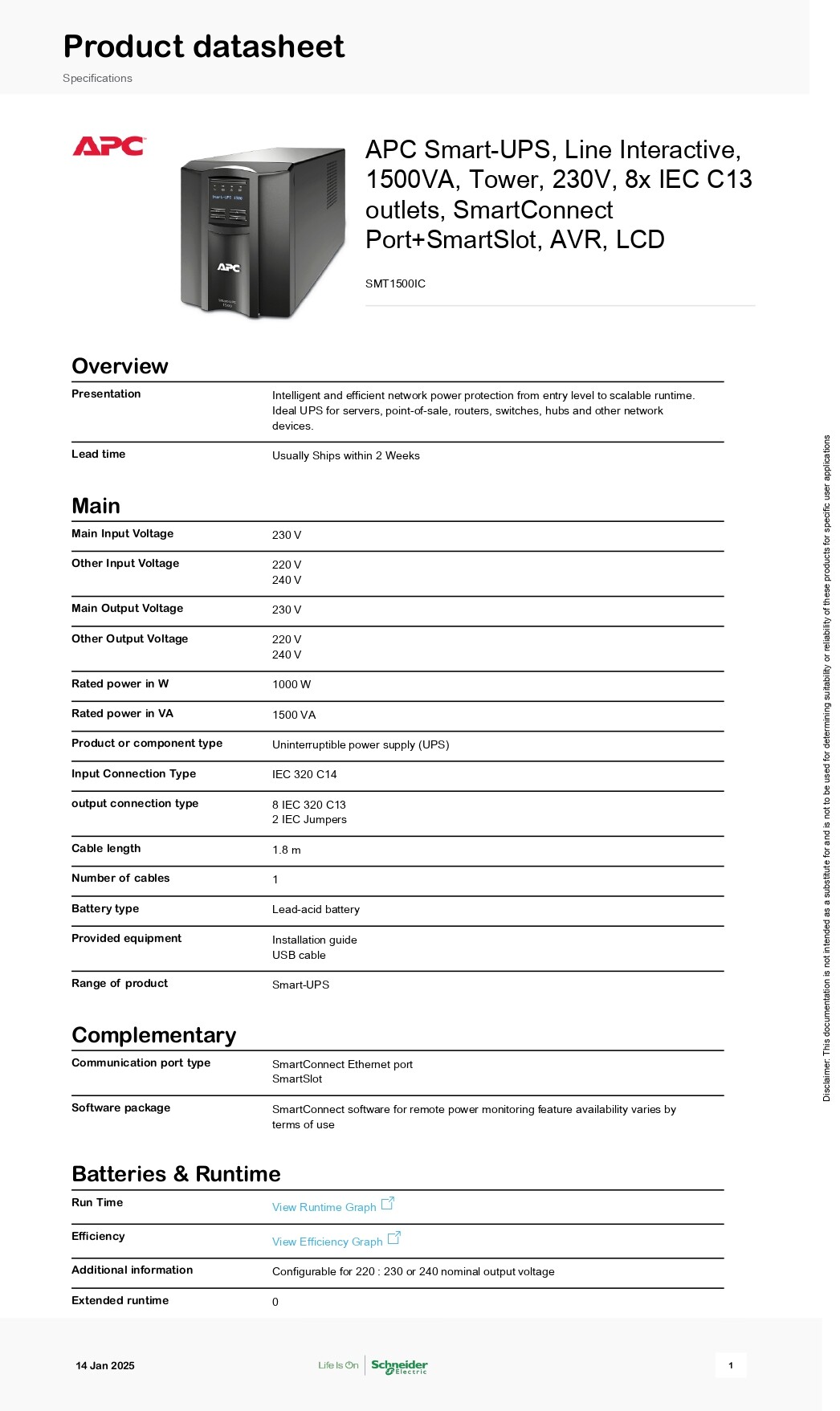 Be the first to review “APC Smart-UPS SMT1500IC, Line Interactive, 1500VA, Tower, 230V, 8x IEC C13 outlets, SmartConnect Port+SmartSlot, AVR, LCD”