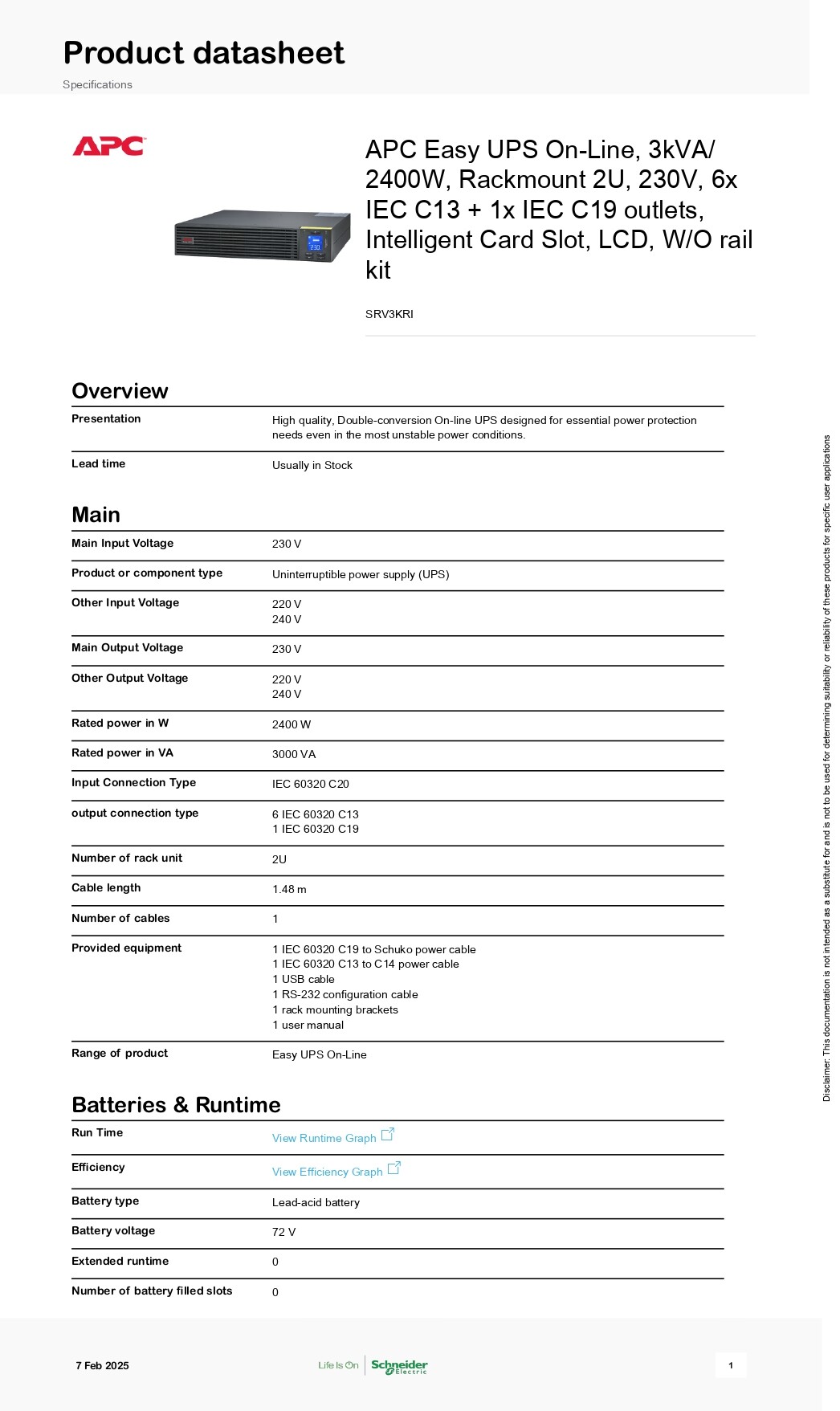 Be the first to review “APC SRV3KRI-E Easy UPS On-Line, 3kVA/2400W, Rackmount 2U, 230V, 6x IEC C13 + 1x IEC C19 outlets, Intelligent Card Slot, LCD, W/O rail kit”