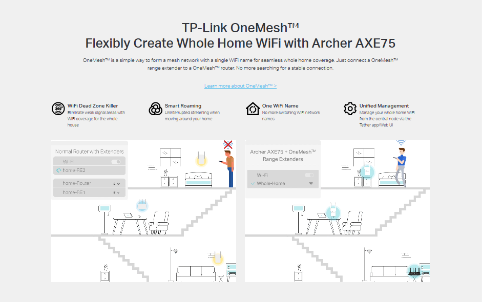 OneMesh™ – Creates a Mesh network by connecting to a TP-Link OneMesh Extender for seamless whole-home coverage.