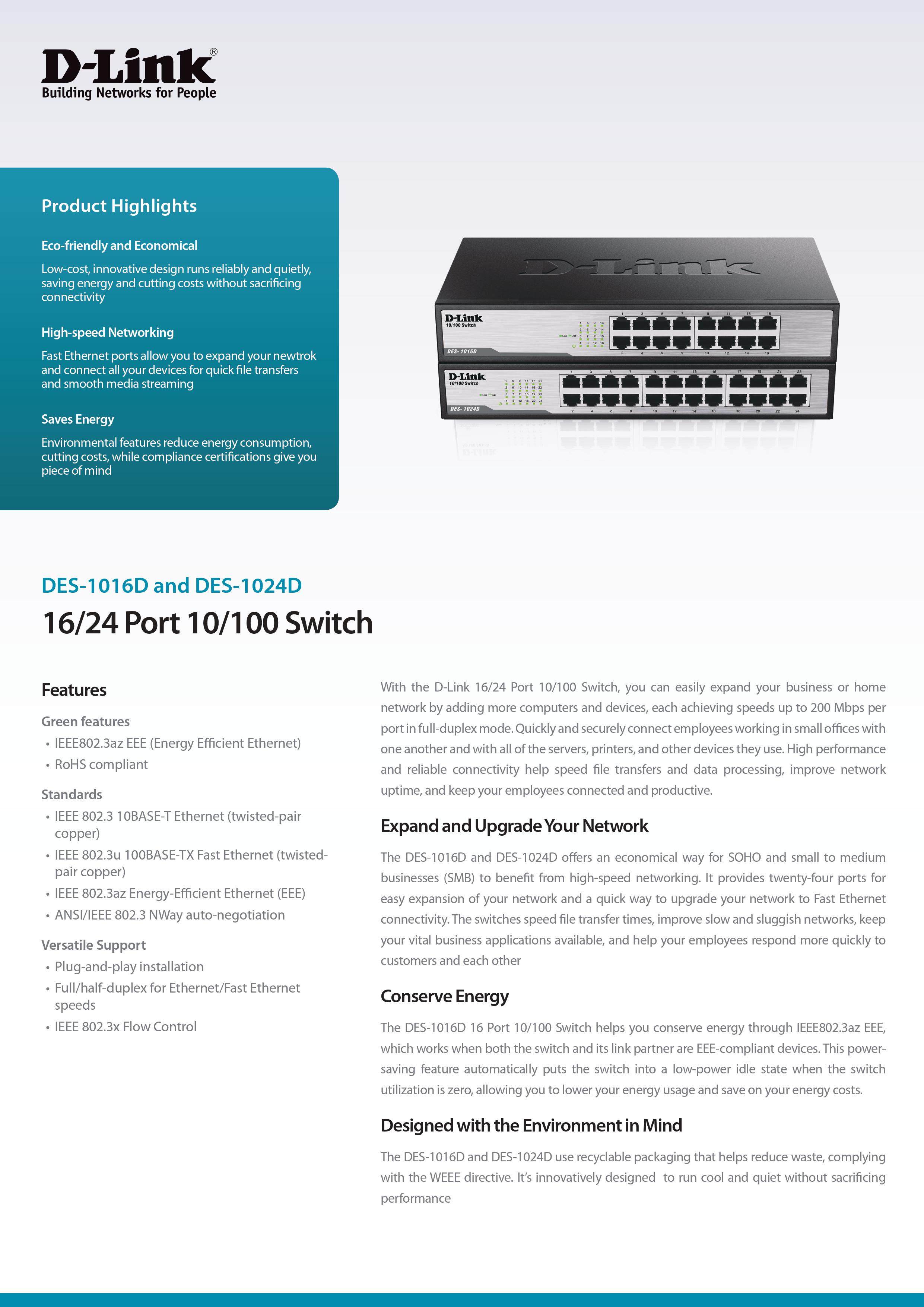 The DES-1016D 16-Port Fast Ethernet Unmanaged Desktop Switch is designed to enhance workgroup performance while providing a high level of flexibility. Powerful yet easy to use, this device allows users to simply plug any port to either a 10Mbps or 100Mbps network to multiply bandwidths, boost response time and satisfy heavy load demands.