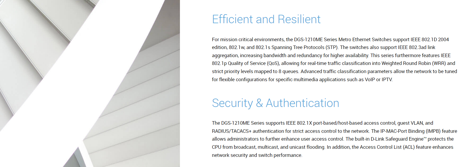 • Enhanced network security with IP-MAC Port-Binding (IMPB), Access Control List (ACL), and IEEE 802.1X