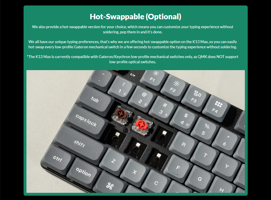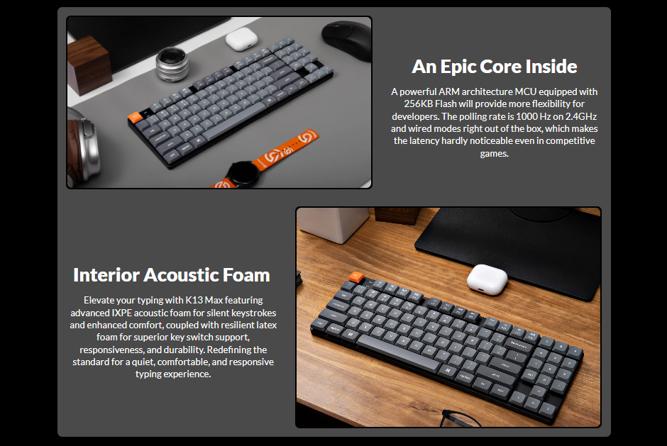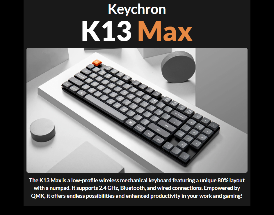 Home/COMPUTER ACCESSORIES/ COMPONENTS/KEYBOARD/Keychron K13 Max QMK/VIA Wireless Custom Mechanical Keyboard Keychron K13 Max QMK/VIA Wireless Custom Mechanical KeyboardRM 440.00 Form Factor: Compact 84-key layout (75% size) with a sleek, space-saving design. Connectivity: Tri-mode connectivity: Bluetooth 5.1, 2.4GHz wireless, and USB-C wired. Supports up to 3 devices via Bluetooth for seamless switching. QMK/VIA Support: Fully programmable with QMK firmware and VIA software for custom key mapping, macros, and lighting effects. Switch Options: Hot-swappable sockets (5-pin) for easy switch customization. Compatible with a wide range of mechanical switches (Keychron optical or Gateron mechanical switches). Keycaps: Double-shot PBT keycaps for durability and resistance to shine. macOS and Windows layouts included. Battery Life: Built-in 4000mAh rechargeable battery. Up to 200 hours of usage (wireless, backlight off) on a single charge. Backlighting: RGB backlighting with multiple lighting effects and customization via QMK/VIA. Build Quality: Aluminum frame for a premium feel and durability. Adjustable feet for ergonomic typing angles. Compatibility: Works with Windows, macOS, Linux, iOS, and Android. Additional Features: N-key rollover (NKRO) for precise and accurate typing/gaming. Includes a USB-C to USB-A cable, 2.4GHz wireless dongle, and keycap/switch puller. SKU: N/A Categories: COMPUTER ACCESSORIES/ COMPONENTS, KEYBOARD Switches Choose an optionRedBrownClear Keychron K13 Max QMK/VIA Wireless Custom Mechanical Keyboard quantity Add to cart Description Additional information Reviews (0) Weight N/A Dimensions N/A Switches Red, Brown Reviews There are no reviews yet. Be the first to review “Keychron K13 Max QMK/VIA Wireless Custom Mechanical Keyboard”Cancel ReplyYour email address will not be published. Required fields are marked *Your rating * Rate… Perfect Good Average Not that bad Very poor Name *Email *Your review * Save my name, email, and website in this browser for the next time I comment. Submit Related products Razer Seiren Mini – Portable Mini Mic (RZ19-03450100-R3M1) RM 180.00 Add to cart ORICO 2189U3 2.5 inch USB3.0 Hard Drive Enclosure RM 27.90 Add to cart Razer Kiyo – Streaming Camera (RZ19-02320100-R3M1) RM 450.00 Add to cart SOLD OUTAsus B150M-A/M.2 6th Generation 1151 Socket Motherboard RM 370.00 Read more