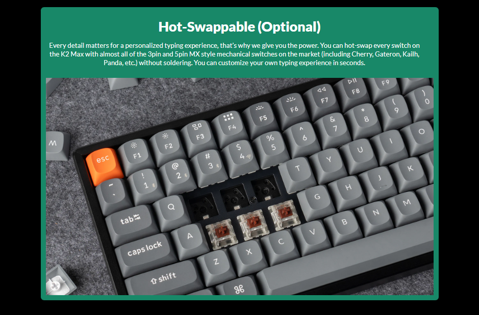 Hot-Swappable Switches: Comes with hot-swappable sockets, enabling you to easily change switches without soldering, catering to your preferred typing feel.
