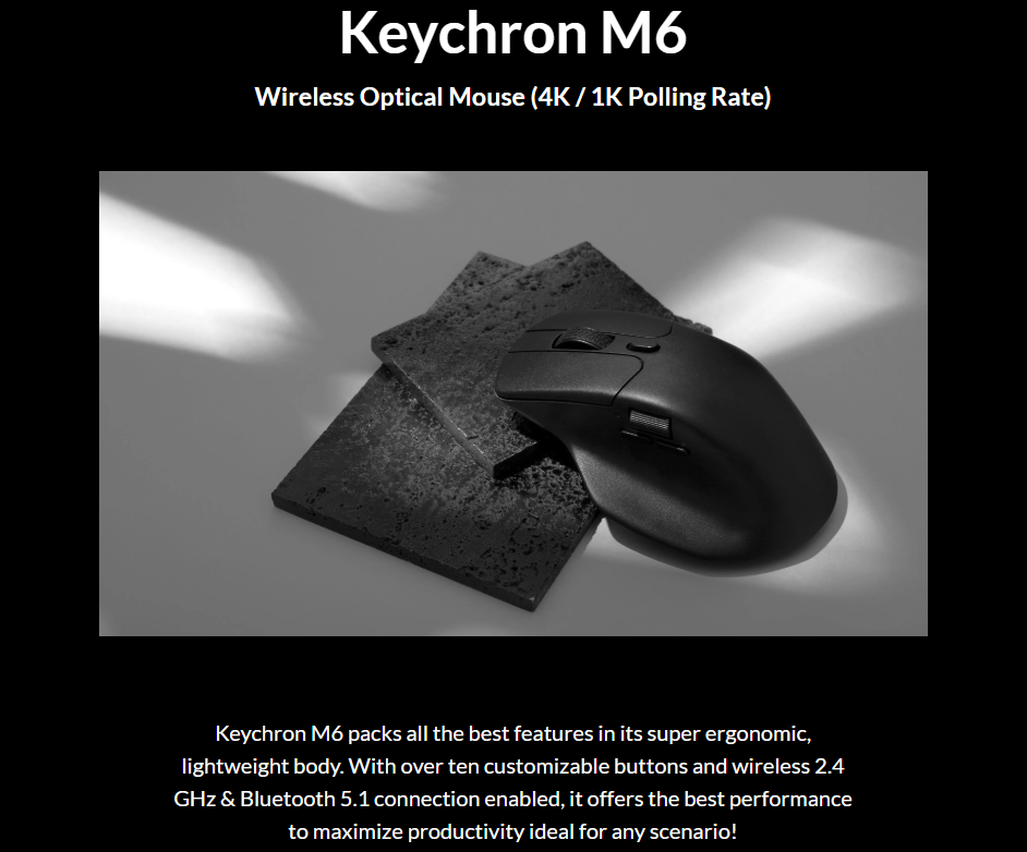 Home/COMPUTER ACCESSORIES/ COMPONENTS/MOUSE/Keychron M6 Wireless Mouse Keychron M6 Wireless MouseRM 196.00 Design: Compact and ergonomic design, suitable for both right-handed and left-handed users. Lightweight build for portability and comfort during extended use. Connectivity: Triple-mode connectivity: Bluetooth, 2.4GHz wireless, and wired (USB-C). Compatible with multiple devices (Windows, macOS, Linux, Android, iOS). Sensor: High-precision optical sensor with adjustable DPI (typically up to 4000 DPI). Customizable DPI settings for sensitivity adjustments. Battery: Built-in rechargeable battery. Long battery life (exact hours depend on usage and connectivity mode). USB-C charging for convenience. Buttons: 6 programmable buttons for customizable functionality. Tactile and responsive switches for a satisfying click experience. Scroll Wheel: Smooth and precise scroll wheel with customizable scroll speed. RGB Lighting: Customizable RGB lighting effects for a personalized look. Adjustable brightness and color options. Portability: Compact size makes it ideal for travel and on-the-go use. Compatibility: Works seamlessly with Keychron keyboards and other devices. Supports multi-device pairing for easy switching. Build Quality: Durable construction with premium materials. Sleek, modern aesthetic that matches Keychron’s design language. SKU: N/A Categories: COMPUTER ACCESSORIES/ COMPONENTS, MOUSE Color Choose an optionBlackWhiteClear Keychron M6 Wireless Mouse quantity Add to cart Description Additional information Reviews (0) Weight N/A Dimensions N/A Color Black, White Reviews There are no reviews yet. Be the first to review “Keychron M6 Wireless Mouse”Cancel ReplyYour email address will not be published. Required fields are marked *Your rating * Rate… Perfect Good Average Not that bad Very poor Name *Email *Your review * Save my name, email, and website in this browser for the next time I comment. Submit Related products ORICO 2020U3-EP 2.5-Inch Hard Drive Enclosure RM 28.00 Add to cart SOLD OUTAVF 3 in 1 High Speed HDMI Cable – 1.8M RM 15.00 Read more Razer Seiren Mini – Portable Mini Mic (RZ19-03450100-R3M1) RM 180.00 Add to cart SOLD OUTWiretek HDMI Cable – 2M RM 89.00 Read more