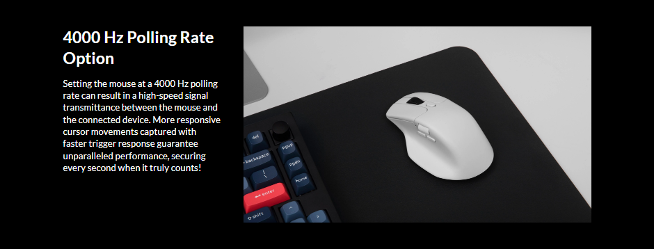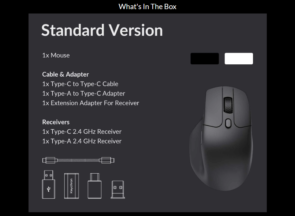 Design: Compact and ergonomic design, suitable for both right-handed and left-handed users. Lightweight build for portability and comfort during extended use. Connectivity: Triple-mode connectivity: Bluetooth, 2.4GHz wireless, and wired (USB-C). Compatible with multiple devices (Windows, macOS, Linux, Android, iOS). Sensor: High-precision optical sensor with adjustable DPI (typically up to 4000 DPI). Customizable DPI settings for sensitivity adjustments. Battery: Built-in rechargeable battery. Long battery life (exact hours depend on usage and connectivity mode). USB-C charging for convenience. Buttons: 6 programmable buttons for customizable functionality. Tactile and responsive switches for a satisfying click experience. Scroll Wheel: Smooth and precise scroll wheel with customizable scroll speed. RGB Lighting: Customizable RGB lighting effects for a personalized look. Adjustable brightness and color options. Portability: Compact size makes it ideal for travel and on-the-go use. Compatibility: Works seamlessly with Keychron keyboards and other devices. Supports multi-device pairing for easy switching. Build Quality: Durable construction with premium materials. Sleek, modern aesthetic that matches Keychron’s design language.