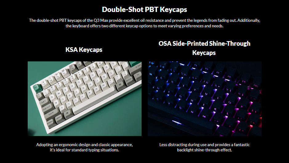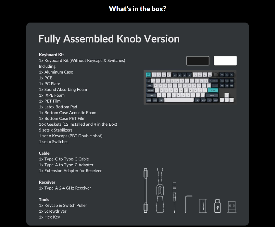 Form Factor: Full-sized (100%) layout with a compact design. Build Quality: Aluminum frame with a premium, durable construction. Doubleshot OSA PBT keycaps for long-lasting durability and resistance to shine. Connectivity: Triple-mode connectivity: Bluetooth 5.1 (up to 3 devices). 2.4GHz wireless via USB receiver. Wired USB-C connection. Switches: Hot-swappable PCB (supports 3-pin and 5-pin mechanical switches). Compatible with a wide range of mechanical switches (e.g., Gateron, Cherry MX, etc.). Customization: Fully programmable via QMK and VIA open-source software. Macros, key remapping, and RGB lighting customization. RGB Lighting: Per-key RGB backlighting with multiple effects and customization options. Battery Life: Built-in 4000mAh battery for extended wireless usage. Up to 200 hours of usage (without RGB) on a single charge. Additional Features: Multi-platform compatibility (Windows, macOS, Linux). Dedicated macOS and Windows keycaps included. Adjustable feet for ergonomic typing angles. Foam padding for improved sound dampening.