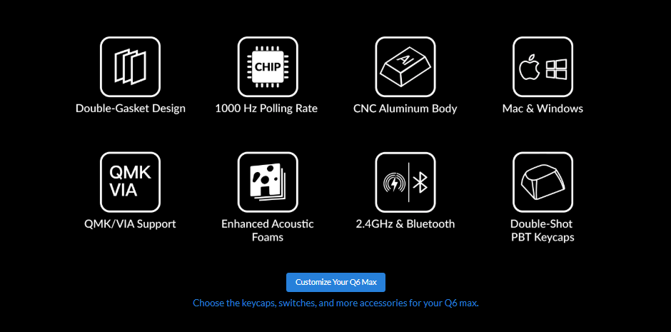 Home/COMPUTER ACCESSORIES/ COMPONENTS/KEYBOARD/Keychron Q6 Max QMK/VIA Wireless Custom Mechanical Keyboard Keychron Q6 Max QMK/VIA Wireless Custom Mechanical KeyboardRM 840.00 Layout: Full-size (104/105 keys) with a dedicated numpad. Build Quality: Aluminum frame with a premium, durable design. Connectivity: Tri-mode connectivity: Bluetooth 5.1, 2.4GHz wireless, and USB-C wired. QMK/VIA Support: Fully programmable via QMK and VIA for custom key mapping and macros. Switch Options: Hot-swappable PCB (5-pin) compatible with a wide range of mechanical switches. Pre-lubed Keychron K Pro switches available (e.g., Brown, Red, Blue). Battery Life: Up to 200 hours of usage (wireless mode, backlight off). Lighting: RGB backlighting with multiple effects, customizable via VIA. Keycaps: Double-shot PBT keycaps for durability and resistance to shine. Gasket Mount: Gasket-mounted design for a softer typing feel and reduced noise. Additional Features: Multi-device pairing (up to 3 devices via Bluetooth). macOS and Windows compatibility with dedicated switch. Adjustable feet for ergonomic typing angles. SKU: N/A Categories: COMPUTER ACCESSORIES/ COMPONENTS, KEYBOARD Variation Choose an optionCarbon BlackShell White Switches Choose an optionRedYellowClear Keychron Q6 Max QMK/VIA Wireless Custom Mechanical Keyboard quantity Add to cart Description Additional information Reviews (0) Weight N/A Dimensions N/A Variation Carbon Black, Shell White Switches Red, Yellow Reviews There are no reviews yet. Be the first to review “Keychron Q6 Max QMK/VIA Wireless Custom Mechanical Keyboard”Cancel ReplyYour email address will not be published. Required fields are marked *Your rating * Rate… Perfect Good Average Not that bad Very poor Name *Email *Your review * Save my name, email, and website in this browser for the next time I comment. Submit Related products ORICO M2P2-C3-C NVME M.2 SSD Duplicator RM 350.00 Add to cart SOLD OUTXPG PRIMER RGB GAMING MOUSE RM 120.00 Read more LOGITECH K120 USB KEYBOARD RM 33.00 Add to cart SOLD OUTAsus B150M-A/M.2 6th Generation 1151 Socket Motherboard RM 370.00 Read more