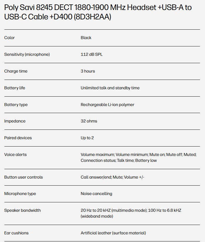 Be the first to review “Poly Savi 8245 DECT 1880-1900 MHz Headset +USB-A to USB-C Cable +D400 (8D3H2AA)”