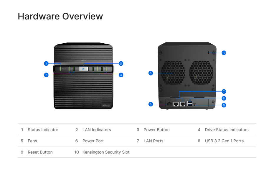 • Compatible drive types: •  4 x 3.5″ or 2.5″ SATA HDD/SSD (drives not included) •  Synology only guarantees full functionality, reliability, and performance for Synology