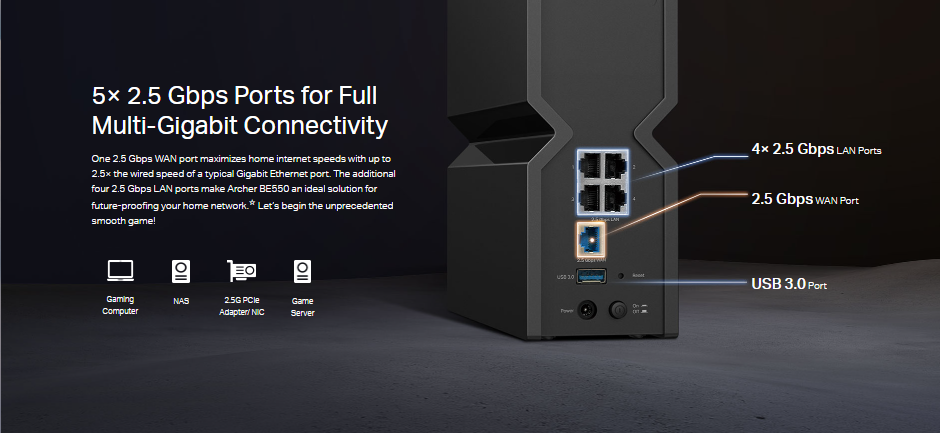 5× 2.5G Ports: 1× 2.5 Gbps WAN port and 4× 2.5 Gbps LAN ports break through the 1G bottleneck, driving your devices to peak performance.