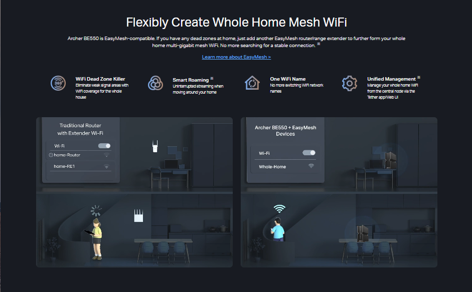 EasyMesh-Compatible: Works with EasyMesh routers and range extenders to form seamless whole home Mesh WiFi, preventing drops and lag when moving between signals.