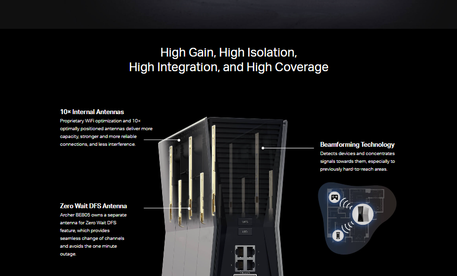 Maximized Coverage: Proprietary WiFi optimization and 10× optimally positioned antennas along with Beamforming deliver more capacity, stronger and more reliable connections, and less interference.