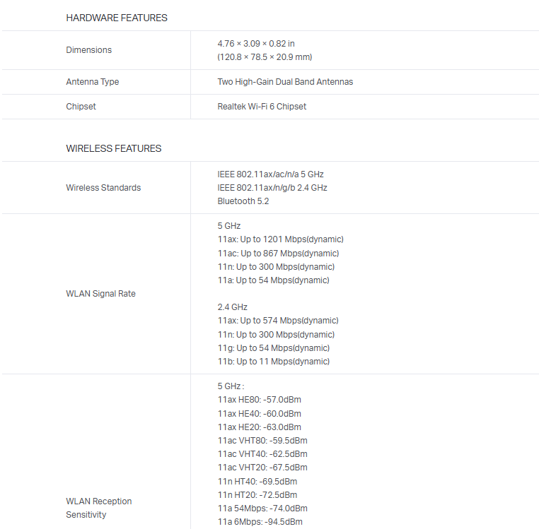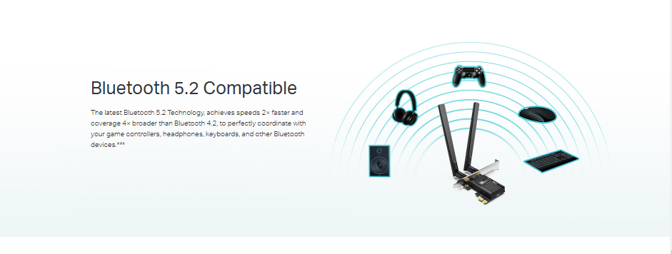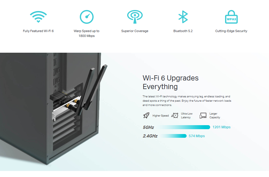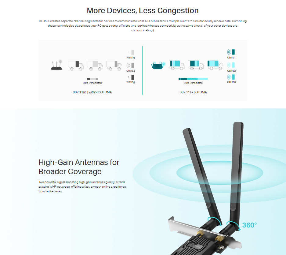 Wi-Fi 6 (AX1800) Dual-Band – Speeds up to 1800 Mbps (1201 Mbps on 5 GHz + 574 Mbps on 2.4 GHz) for smooth streaming and gaming. Bluetooth 5.2 – Faster speeds and extended range for connecting wireless peripherals. OFDMA & MU-MIMO – Improves network efficiency by handling multiple devices simultaneously. High-Gain Antennas – Ensures a stronger and more stable wireless connection. PCIe Interface – Provides high-speed data transfer with reduced latency. WPA3 Security – Enhanced encryption for better protection against cyber threats. Wide Compatibility – Supports Windows 10 and 11 (drivers required).