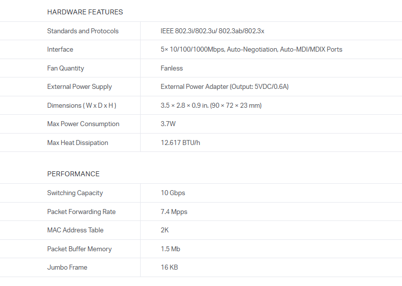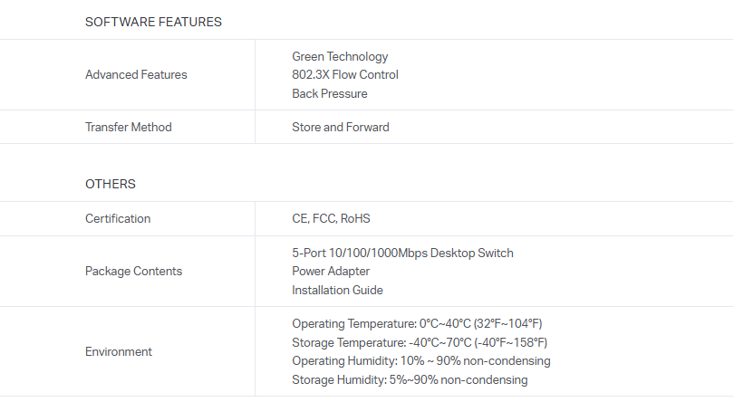 5-Port Gigabit Ethernet Switch: Supports 10/100/1000Mbps Ethernet speeds. Plug-and-Play: No configuration required; simply connect your devices. Compact Design: Small and lightweight, making it easy to place anywhere. Energy Efficient: Automatically adjusts power consumption based on link status and cable length. Durable Metal Housing: Provides robust protection and heat dissipation. Compatibility: Works with most Ethernet-enabled devices.