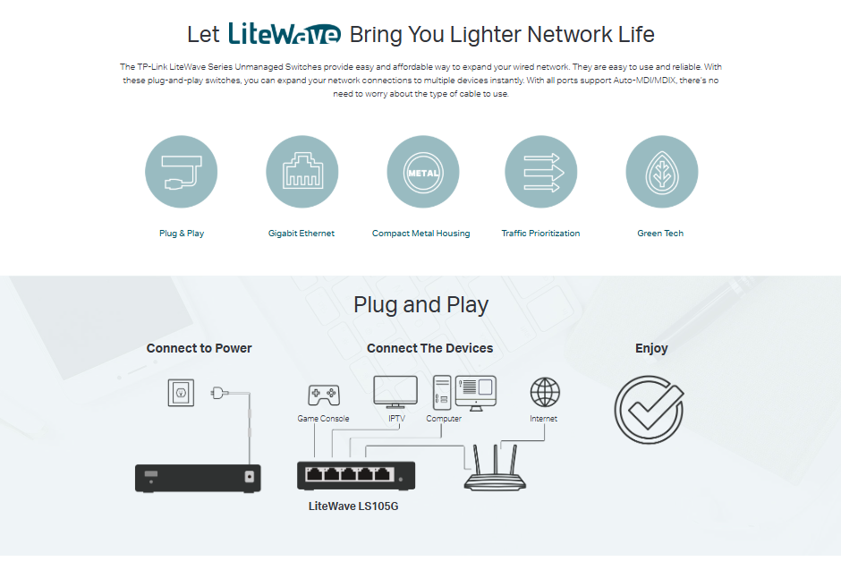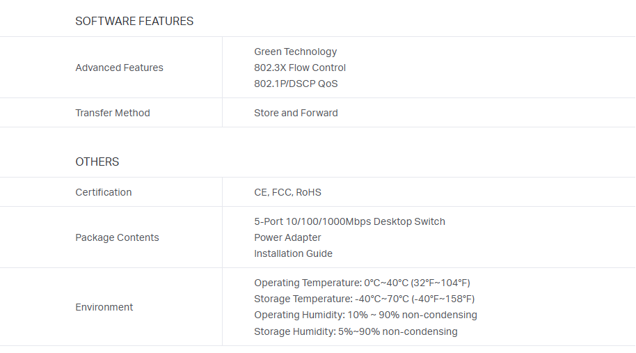 5-Port Gigabit Ethernet Switch: Supports 10/100/1000Mbps Ethernet speeds. Plug-and-Play: No configuration required; simply connect your devices. Compact Design: Small and lightweight, making it easy to place anywhere. Energy Efficient: Automatically adjusts power consumption based on link status and cable length. Durable Metal Housing: Provides robust protection and heat dissipation. Compatibility: Works with most Ethernet-enabled devices.
