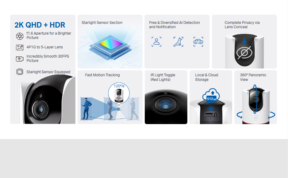 1080p Full HD Resolution: Delivers clear and detailed video footage. Infrared Night Vision: Provides night vision up to 30 feet (9 meters) in complete darkness. Automatically switches to night mode in low-light conditions. Motion Detection & Alerts: Sends real-time alerts to your smartphone when motion is detected. Customizable motion detection zones to reduce false alerts. Two-Way Audio: Built-in microphone and speaker for clear communication through the Tapo app. Local and Cloud Storage: Supports microSD card storage (up to 128GB) for local recording. Optional cloud storage for additional backup (subscription required). Tapo App Control: Easy setup and control via the Tapo app (available for iOS and Android). View live footage, adjust settings, and receive alerts. Smart AI Features: Advanced motion detection with person and pet detection (optional subscription required). Compact Design: Sleek and unobtrusive design for easy placement in any room. Compatibility: Works with Alexa and Google Assistant for voice control.