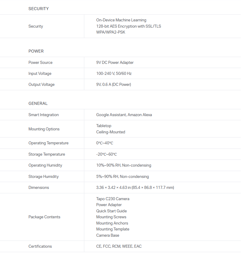 Pan/Tilt Functionality: 360° horizontal pan and 114° vertical tilt for complete coverage of your indoor space. Control the camera’s movement remotely via the Tapo app. 1080p Full HD Resolution: Delivers clear and detailed video footage. Infrared Night Vision: Provides night vision up to 30 feet (9 meters) in complete darkness. Automatically switches to night mode in low-light conditions. Motion Detection & Alerts: Sends real-time alerts to your smartphone when motion is detected. Customizable motion detection zones to reduce false alerts. Two-Way Audio: Built-in microphone and speaker for clear communication through the Tapo app. Local and Cloud Storage: Supports microSD card storage (up to 128GB) for local recording. Optional cloud storage for additional backup (subscription required). Tapo App Control: Easy setup and control via the Tapo app (available for iOS and Android). View live footage, adjust settings, and receive alerts. Smart AI Features: Advanced motion detection with person and pet detection (optional subscription required). Compatibility: Works with Alexa and Google Assistant for voice control.