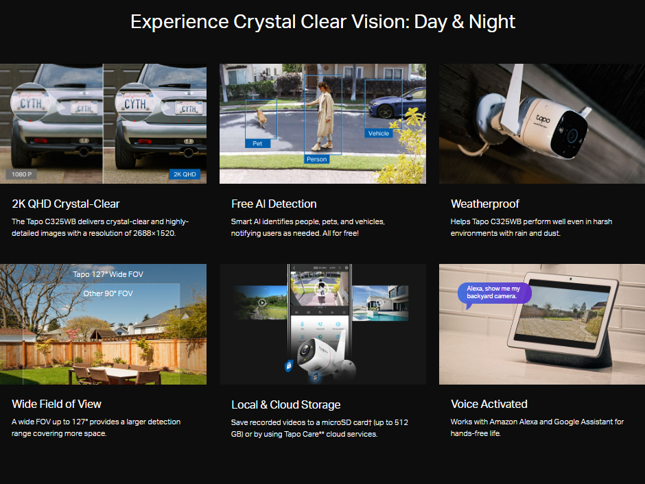 2K QHD Resolution: Delivers ultra-clear and detailed video footage (2304 × 1296 pixels). Infrared Night Vision: Provides night vision up to 30 feet (9 meters) in complete darkness. Automatically switches to night mode in low-light conditions. Motion Detection & Alerts: Sends real-time alerts to your smartphone when motion is detected. Customizable motion detection zones to reduce false alerts. Two-Way Audio: Built-in microphone and speaker for clear communication through the Tapo app. Weatherproof (IP66 Rating): Designed to withstand harsh outdoor conditions like rain, dust, and extreme temperatures. Local and Cloud Storage: Supports microSD card storage (up to 256GB) for local recording. Optional cloud storage for additional backup (subscription required). Tapo App Control: Easy setup and control via the Tapo app (available for iOS and Android). View live footage, adjust settings, and receive alerts. Smart AI Features: Advanced motion detection with person and pet detection (optional subscription required).
