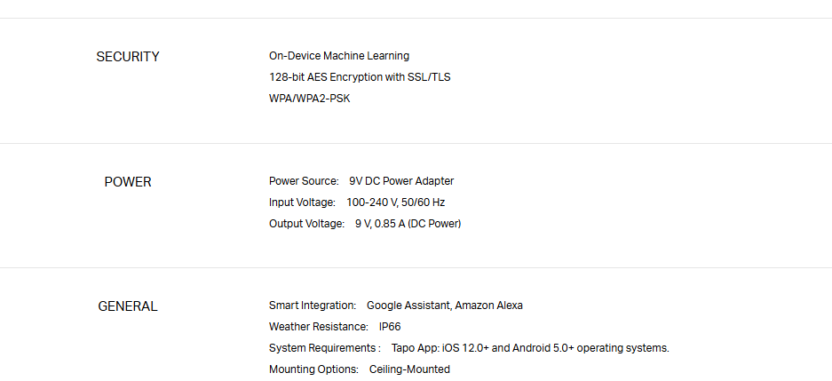 Pan/Tilt Functionality: 355° pan and 120° tilt for complete coverage of your property. Control the camera’s movement remotely via the Tapo app. 1080p Full HD Resolution: Delivers clear and detailed video footage. Infrared Night Vision: Provides night vision up to 30 feet (9 meters) in complete darkness. Automatically switches to night mode in low-light conditions. Motion Detection & Alerts: Sends real-time alerts to your smartphone when motion is detected. Customizable motion detection zones to reduce false alerts. Two-Way Audio: Built-in microphone and speaker for clear communication through the Tapo app. Weatherproof (IP66 Rating): Designed to withstand harsh outdoor conditions like rain, dust, and extreme temperatures. Local and Cloud Storage: Supports microSD card storage (up to 256GB) for local recording. Optional cloud storage for additional backup (subscription required). Tapo App Control: Easy setup and control via the Tapo app (available for iOS and Android). View live footage, adjust settings, and receive alerts. Smart AI Features: Advanced motion detection with person and pet detection (optional subscription required). Compatibility: Works with Alexa and Google Assistant for voice control.