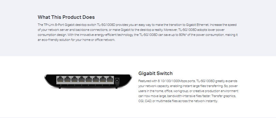 8-Port Gigabit Ethernet Switch: Supports 10/100/1000Mbps Ethernet speeds. Plug-and-Play: No configuration required; simply connect your devices. Compact Design: Small and lightweight, making it easy to place anywhere. Energy Efficient: Automatically adjusts power consumption based on link status and cable length. Durable Metal Housing: Provides robust protection and heat dissipation. Compatibility: Works with most Ethernet-enabled devices.