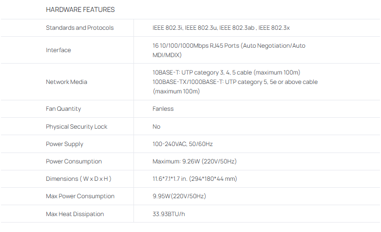 16-Port Gigabit Ethernet Switch: Provides 16 Gigabit Ethernet ports for high-speed data transfer. Plug-and-Play: No configuration required; simply connect your devices. Energy Efficient: Automatically adjusts power consumption based on link status and cable length. Durable Metal Housing: Provides robust protection and heat dissipation. Compact Design: Small and lightweight, making it easy to place anywhere. Compatibility: Works with most Ethernet-enabled devices.
