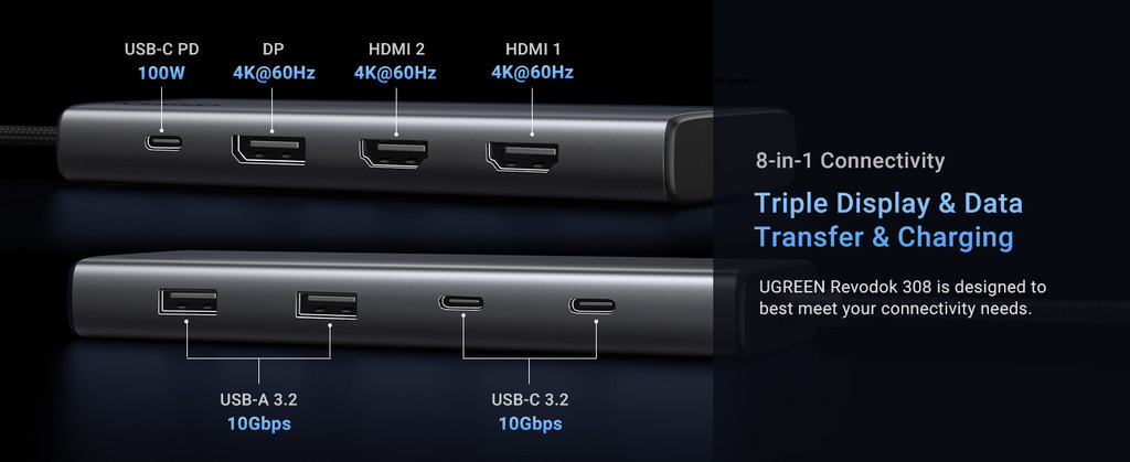 – USB-A: Theoretical transfer rate of up to 10Gbps; USB-C: Supports PD 3.0, 100W Max (does not support data/video streaming)