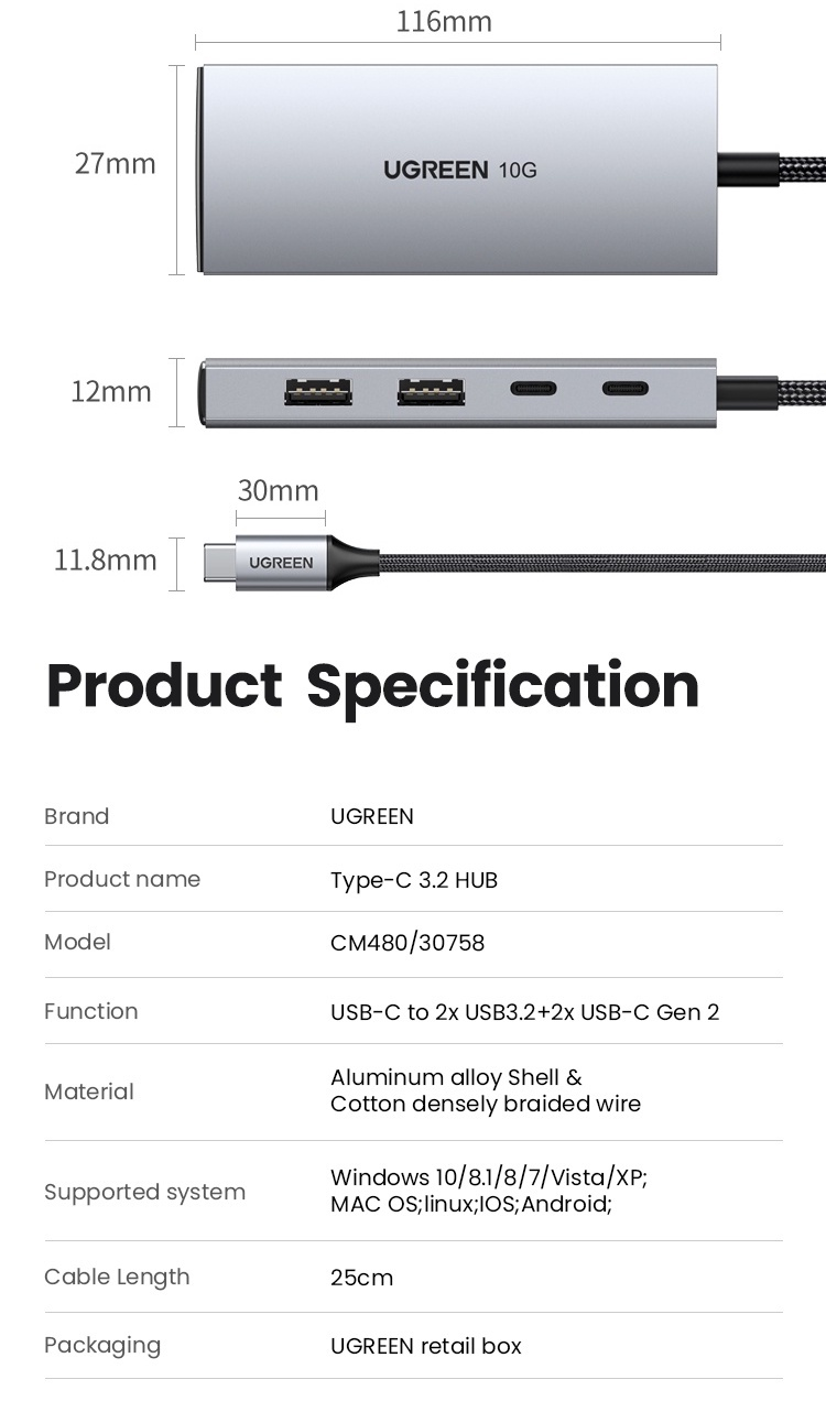 UGREEN USB-C 3.2 10GBPS 2*USB-A 3.2+ 2*USB-C 3.2 HUB ALUMINUM CASE – Input: USB-C Male – Output: 2x USB-A 3.2 + 2x USB-C 3.2, USB 3.1 Gen2 speed up to 10Gpbs – Aluminum Case – Cable Length: 25cm