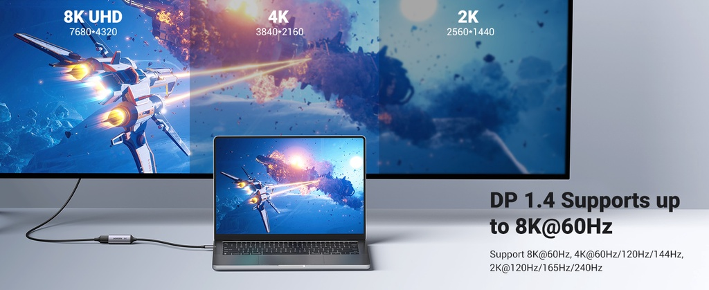 UGREEN USB-C TO DP 1.4 FEMALE CONVERTER 8K@60HZ/4K@120HZ – Total Bandwidth: 32.4Gbps – HDCP: 2.3 and backward compatible -Function Supported: 3D Visual Effect, HDR (High Dynamic Range), Audio-to-Video Sync – Resolution: Up to 8K@60Hz